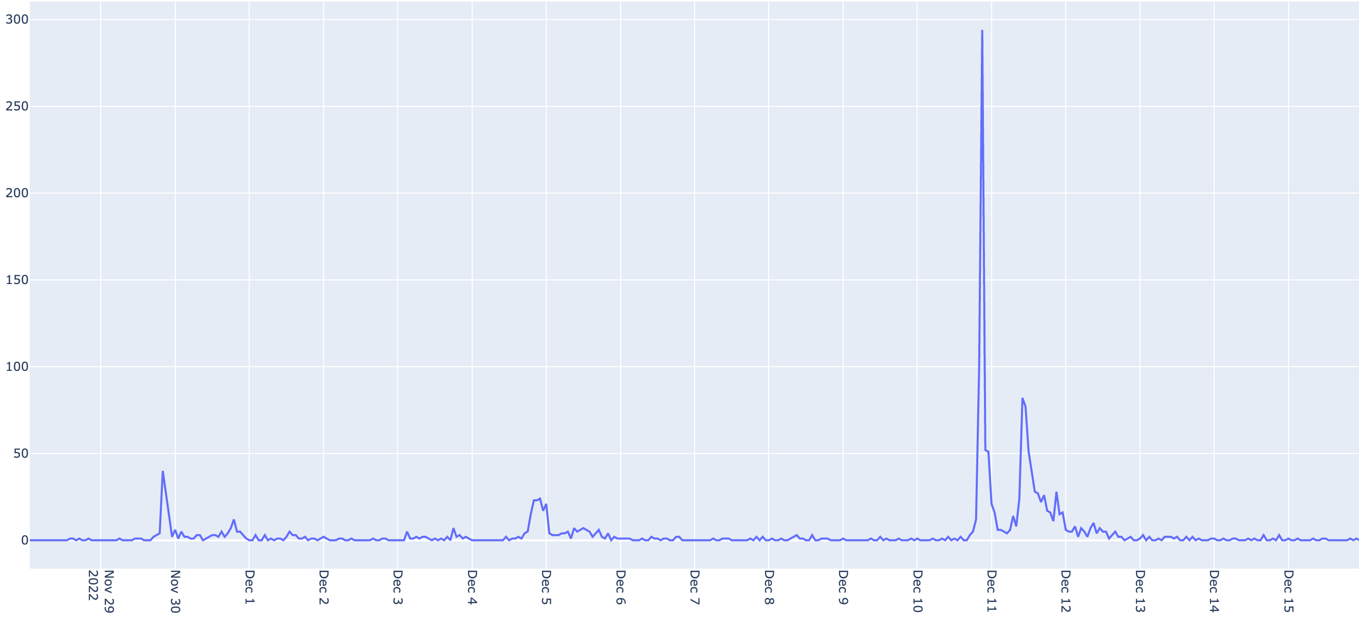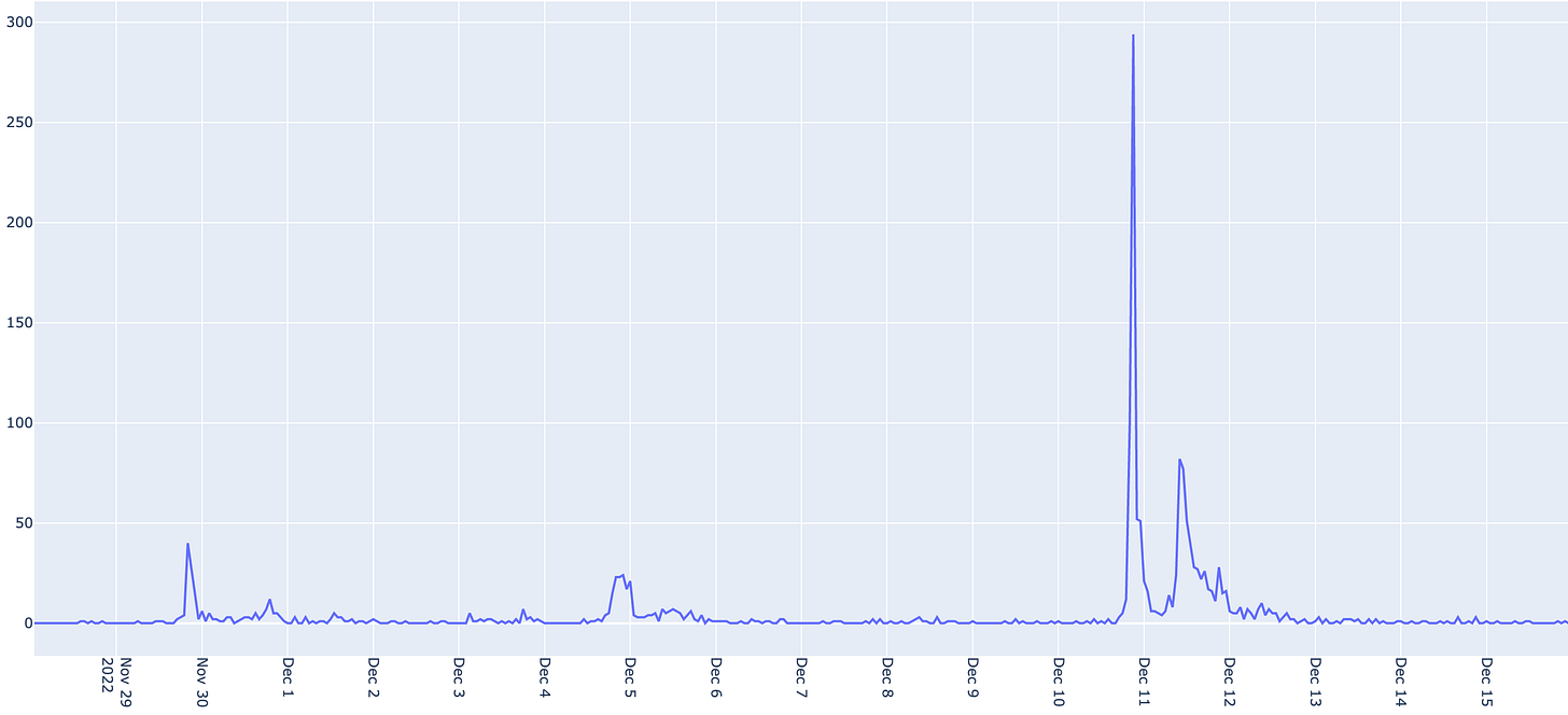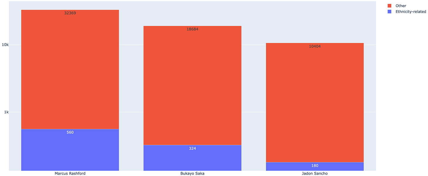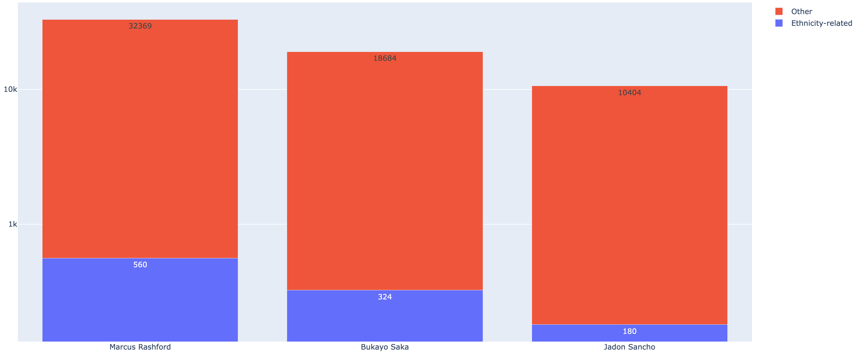 Again, note the log plot - it is only a relatively small percentage of the tweets that are related to ethnicity. This is not to say that the impact of these tweets is small however. Being on the receiving end of potentially ~500 explicitly racist tweets in the space of a few days (likely in addition to similar hate sent via DM and other means) is undoubtedly a horrifying and potentially traumatic experience. Though not reproduced here, I can attest to the abhorrent nature of some of these tweets having viewed them myself. Just receiving one such message would be a horrendous ordeal.