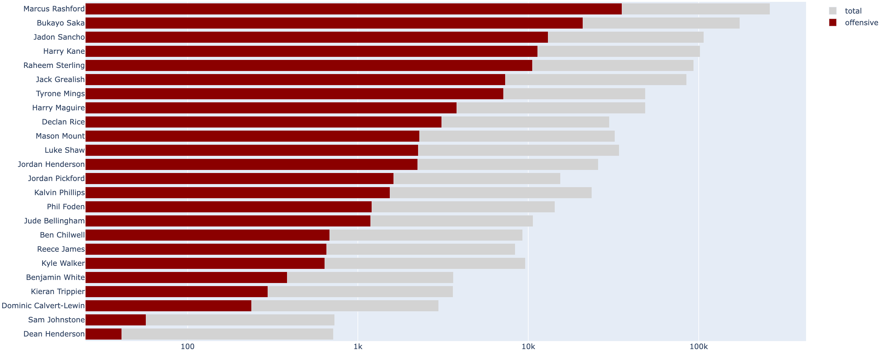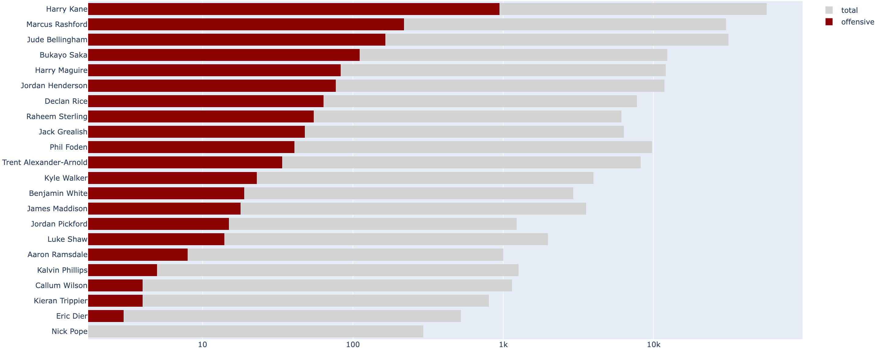 As can be seen, Marcus Rashford, Bukayo Saka, and Jadon Sancho were targeted most in the Euros, and Harry Kane at the World Cup. In fact, the abuse aimed at Rashford, Saka, and Sancho at the Euros accounts for 77% of all of the hateful messages received by England players during the data collection period. And those directed at Kane at the World Cup account for 48% of the total. That these players were targeted is again unsurprising: all 4 missed crucial penalties that led directly to England’s defeat and elimination. Whilst they may have been consoled by their teammates and supporters in the stadium, others were quick to vent their anger online.4