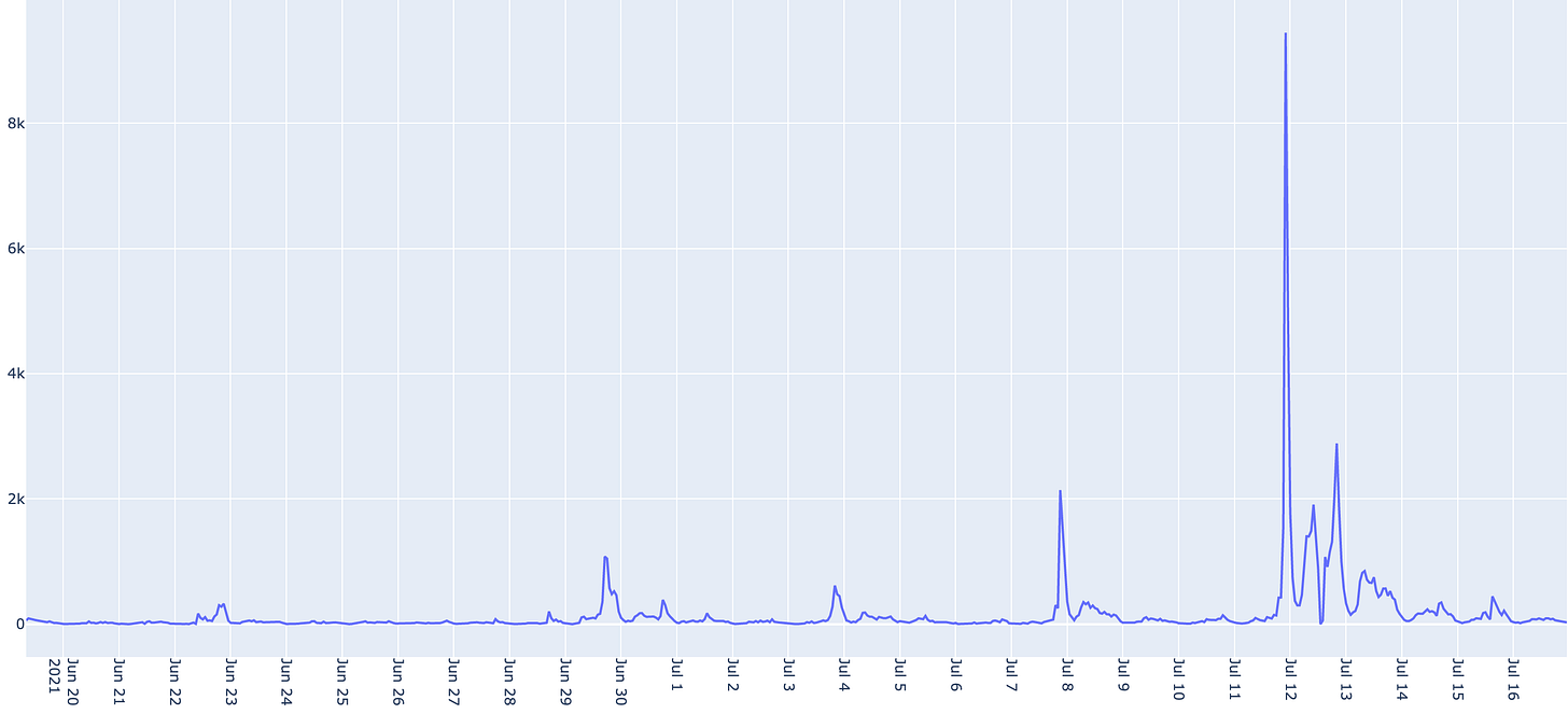 In both tournaments, the overwhelming majority of abusive tweets came in the aftermath of England’s last game of the tournament - their final loss on penalties to Italy in the Euros, and their quarter-final exit to France at the World Cup. The plots below shows the number of hateful tweets across the data collection period for both tournaments, with significant upticks following these games.